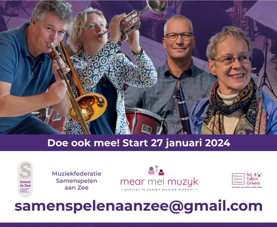 samen muziek maken Heb je altijd al een blaas- of slagwerkinstrument willen leren bespelen? Of lijkt samen muziek maken je geweldig? ð Dan is dit je kans! Muziekfederatie Samenspelen aan Zee organiseert Nieuw Talent Orkest De Bevelanden, een uniek muziekproject voor volwassenen. In tien repetities ervaar je hoe fantastisch het is om samen muziek te maken. De eerste repetitie is op zaterdag 27 januari 2024, 10.00 uur in het OdyZee College in Kloetinge. Dit belooft een bijzondere ochtend te worden onder de enthousiaste muzikale leiding van Guus Pieksma, initiatiefnemer van Nij Talint Orkest uit Sneek. Om mee te kunnen doen hoef je geen muzikale ervaring te hebben of noten te kunnen lezen. De repetities duren twee uur en die vliegen voorbij! Natuurlijk is er een pauze en het plezier staat voorop. Het project sluit af met een feestelijk concert. Doe ook mee! De muziekfederatie zorgt voor een instrument en lessenaar. Misschien weet je al welk instrument je wilt bespelen en anders kies je op de eerste repetitie een instrument. Verder krijg je een complete orkestmap. Meer dan 3.000 Nieuw Talent Orkest muzikanten gingen je voor en ontdekten een geweldige nieuwe hobby! Wat je moet weten Startdatum: zaterdag